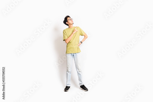 Single skinny young male. The full body of an Asian or Indonesian person. Isolated photo studio with white background.