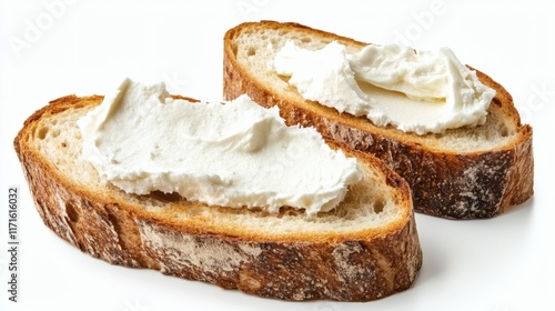 single slice of toasted bread spread with cream cheese isolated on white transparent background