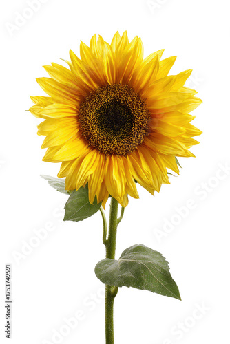 Single sunflower, vibrant yellow petals, dark center, green stem and leaves, isolated on black