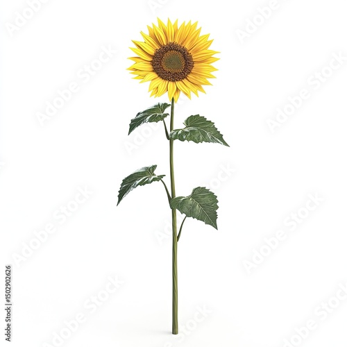 Single sunflower with bright yellow petals and dark center. Green leaves and a tall, slender stem