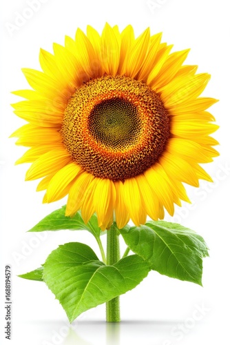 Single sunflower with vibrant yellow petals and a dark center, bright green leaves on a long stem, isolated against white background