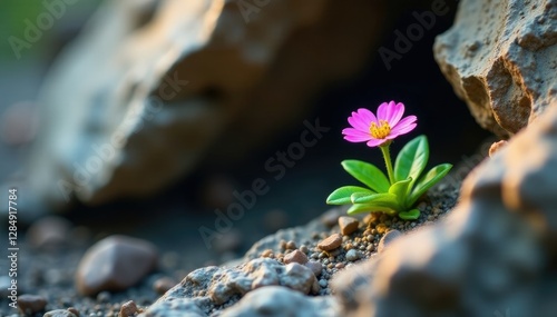Single tiny wildflower peeking from rocky crevice, tiny, rocky crevice