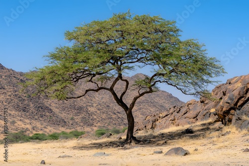 Single Tree in Arid Landscape with Rocky Mountains and Blue Sky