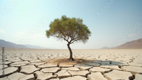 Single tree standing on cracked dry desert ground with distant mountains under bright clear sky symbolizing resilience survival and climate change concept of environmental conservation, sustainability