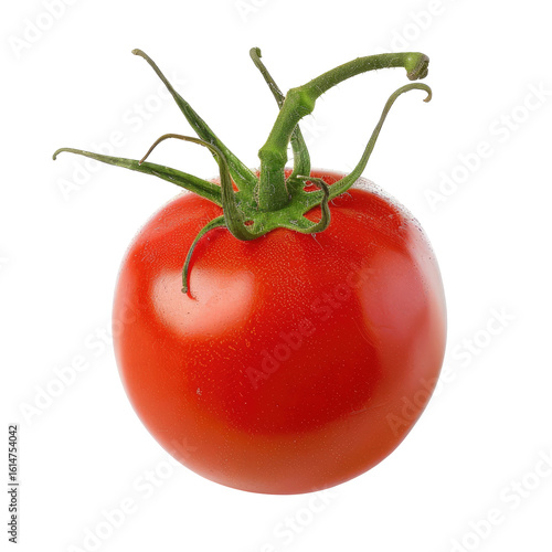 Single, vibrant red tomato, displaying a smooth skin and green stem