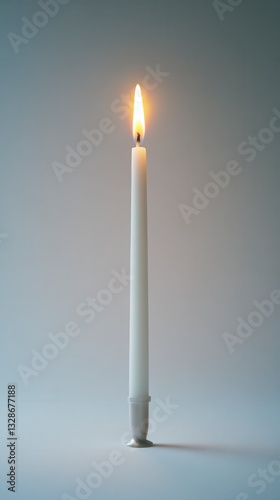 Single white candle with a small flame burning in a simple holder against a light gray background. Clean and minimalist aesthetic.