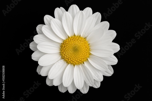 Single white chrysanthemum blossom featuring a vibrant yellow core against a dark backdrop