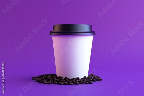 Single white coffee cup surrounded by coffee beans on a vibrant purple background