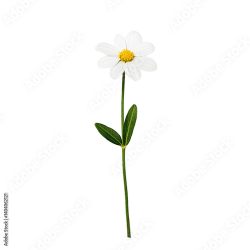 single white daisy with yellow center and green leaves on long stem, isolated on transparency background, evokes simplicity and purity