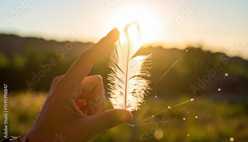 Single White Feather Poised in Filtered Sunlight at Sunset View