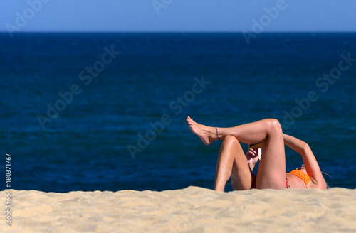 Single woman reading on the beach, Batata beach, Atlantic Ocean, Lagos, city center, Faro district, Algarve, Portugal, Europe