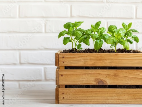 Single wooden crate with seedlings inside, minimalist planting starter kit