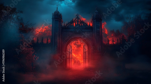 Sinister night landscape with heaven and hell gates, souls in torment amidst smoke and darkness, eerie mist and cobwebs surrounding a fiery, red glowing entrance