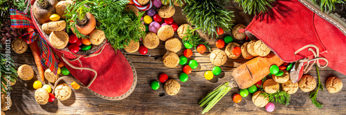Sinterklaas, Saint Nicholas day background. Little kid red shoe with carrots and sweets, trooigoed, pepernoten, candy. Dutch Christmas holiday on cozy wooden background.