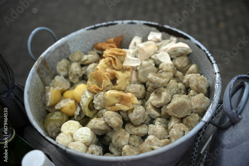 Siomay in the pan and ready to be sold. Siomay are fish cake dumplings with potatoes, eggs and rolled cabbage served with peanut sauce and chili. Siomay is a traditional Indonesian culinary food.