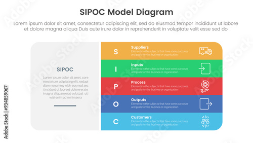 sipoc infographic template banner with big round rectangle box and vertical point stack with 5 point list information for slide presentation