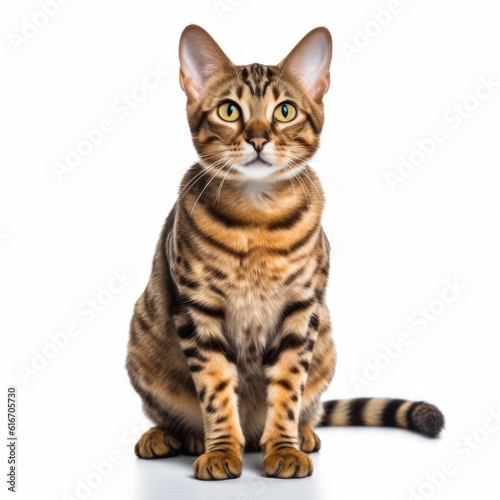 Sitting Bengal Cat. Isolated on Caucasian, White Background. Generative AI.