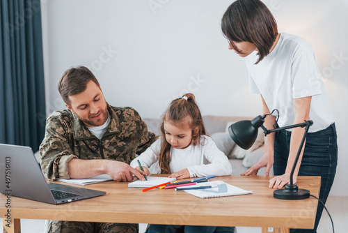 Sitting by the table. Soldier in uniform is at home with his wife and daughter