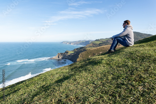 Sitting man at the top of green hill looking at the flysch coastline. Basque Country destination