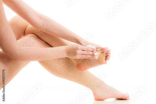 Sitting naked woman cleaning her feet
