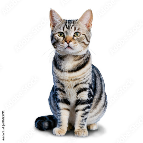 Sitting tabby cat with stripes isolated on transparent background. Png image of gray and black animal with yellow eyes.