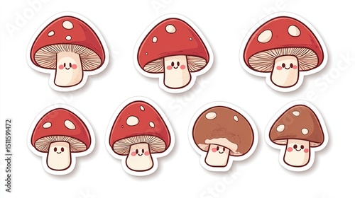 Six adorable cartoon mushroom stickers; three red with white spots, three brown, all with smiling faces and white borders
