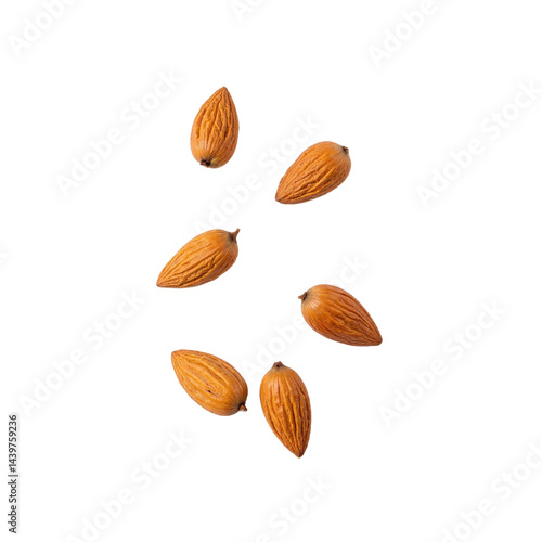 Six almonds scattered on a transparent background.