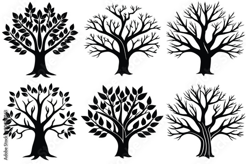 Six Black and White Silhouettes of Trees with Different Stages of Foliage