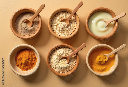 Six Bowls With Spoons Containing Various Powders And Liquids