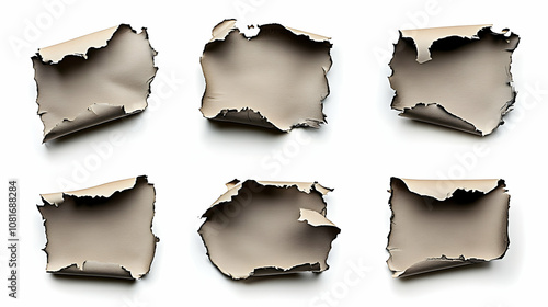 Six Burnt Beige Paper Fragments Arranged on White Background