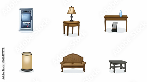 Six cartoon illustrations of home furniture, including a lamp, sofa, table, and a TV.