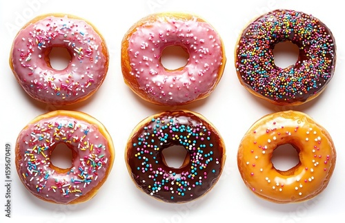 Six colorful glazed donuts with various sprinkles arranged in two rows on a white background evoking a cheerful and appetizing mood