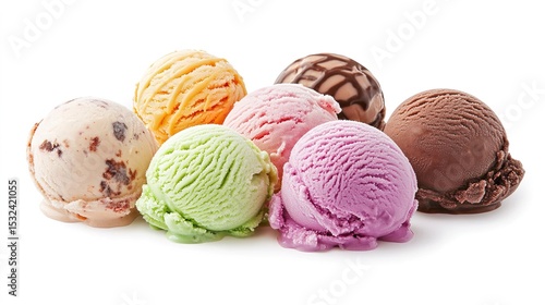Six colorful scoops of ice cream in various flavors arranged together on a white background.