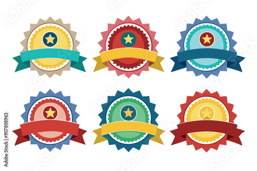Six Colorful Star-Shaped Award Badges with Ribbons