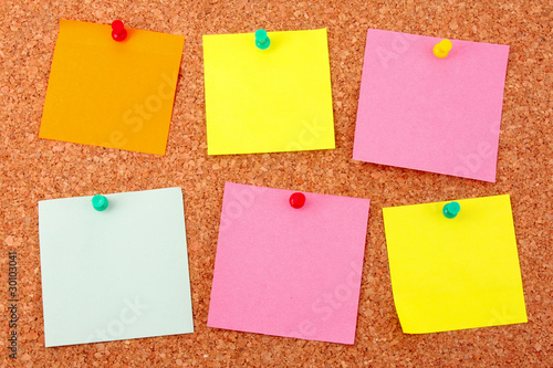 Six colorful stickers pinned to a cork board