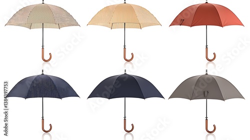 Six colorful umbrellas, beige, orange, red, navy, and grey, displayed with wooden handles on a white background