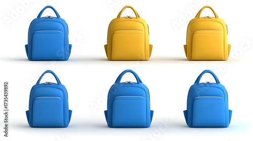 Six different views of a blue and yellow backpack. Various angles and perspectives. On a white background. Concept of backpack design. 3D Rendering