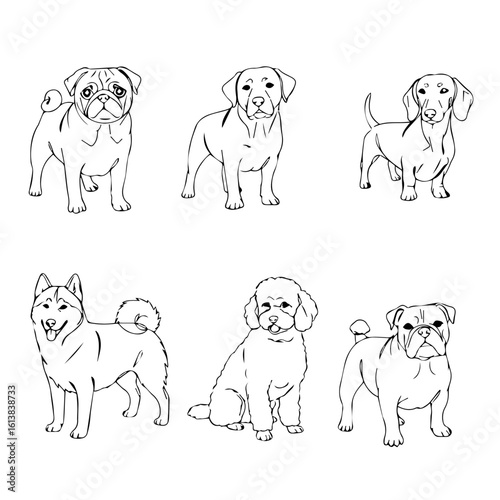 Six distinct dog breed sketches showcasing various poses and unique characteristics in simple line art