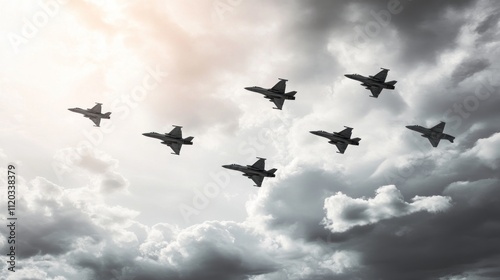 Six fighter jets fly in formation against a dramatic sky.