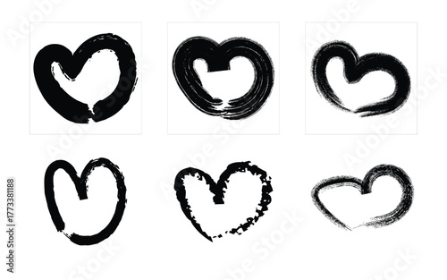 Six hand drawn black hearts with a brush stroke texture on a white background