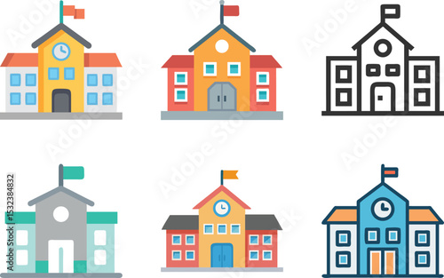Six icon Collection of School Building Icons in Different Styles and Color Schemes
