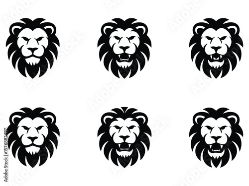 Six lion heads are arranged on a white backdrop, displaying a bold, graphic design with strong animal symbol presence.