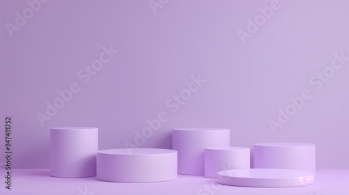 Six Minimalist Purple Toned Round Podiums for Product Presentation on Empty Background. Ideal for E-commerce and Advertising Displays, Showcasing Minimalist Style and Elegance