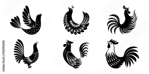 Six stylized black birds isolated on a white background