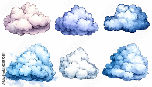 Six watercolor-style cloud illustrations; various shades of blue, white, and purple; for weather, design, or animation use