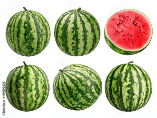 Six Watermelons Displayed on White Background Studio Shot Fresh Ripe Fruit Summer Food Healthy Eating Still Life Close Up