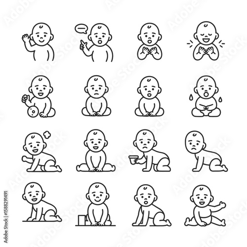 Sixteen Black and White Line Drawings of Infants Displaying Various Actions and Expressions Including Sitting Playing Crawling and Communicating