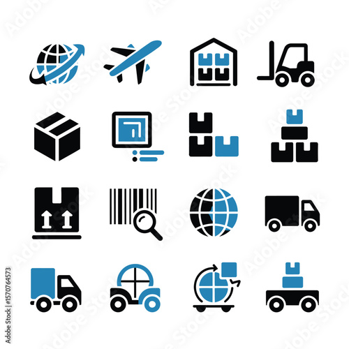 Sixteen Blue and Black Logistics Icons Set Global Shipping Delivery Transportation Warehouse Packages Boxes Airplane Truck Forklift Barcode World Map
