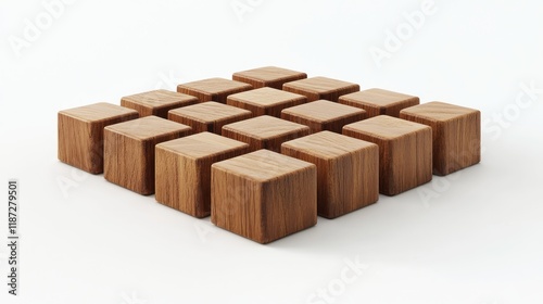 Sixteen brown wooden cubes arranged in a grid on a white background.