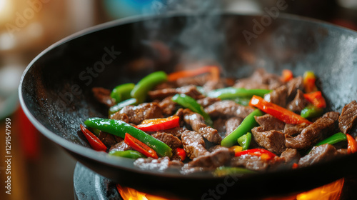 Sizzling beef stir fry with colorful vegetables in hot wok steam rising cooking process